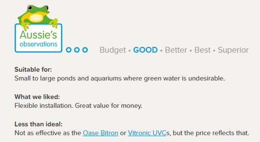 The following material is provided as a service to our customers and is for the sole purpose of sharing our knowledge of ponds, fountains and equipment with other water garden enthusiasts. The idea of giving a product a position in our product range is to give an approximate comparison to other products that we sell. It based on many things including our experience and observations, customer feed back, manufacturers information, warranty length, energy used (Watts), magazine articles and any other input we have found etc.