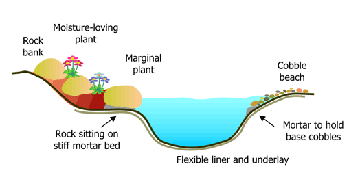 This pond has a cobblestone edge, which have smooth edges. Part of the cobblestones go into the water and a "lip" was created while the pond was being dug to hold back the cobblestones from entering the pond.