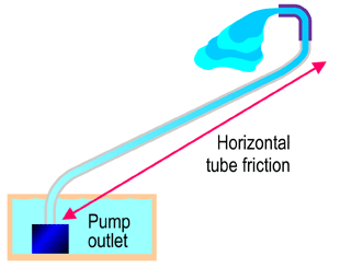 Pumping water through tubing adds resistance, so an allowance must be made for friction loss inside the tube. As a rule of thumb add 10cm of head for every 1 meter of horizontal tubing run. However as the size of the tubing has a significant bearing on frictional resistance, the use of an undersize tube will increase frictional losses. See chart below.