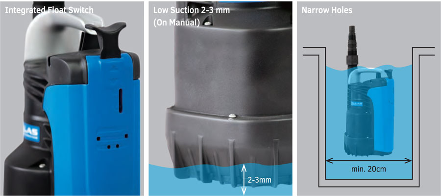 Can fit into small spaces, small sump stations. Vetrical outlet on top of pump. Internal float mechanism.
