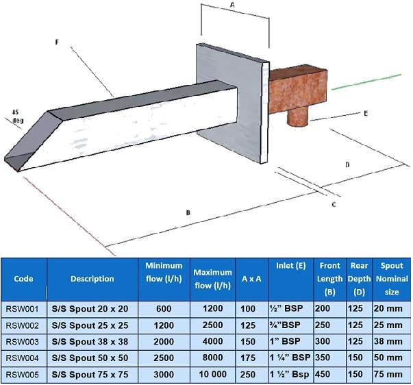 Our square wall spouts are Australian made from 316 stainless steel. Each comes with a square backing plate for easy fixing into your wall. This is perfect for a modern looking feature.