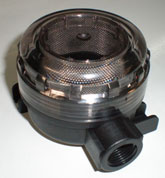 | Model No. 01740-002 (01740-102) Inline suction strainer 12.5mm hose barb, polypropylene base, polysulfone clear cover, stainless steel 40 mesh screen, Buna-N FDA O-Ring. Two lugs for secure mounting. Suits potable water. |