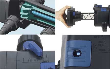 The Oase Bitron C range is the cream of the crop when it comes to Ultra Violet Clarifiers. They have a unique automatic self cleaning rotor which keeps the quartz sleeve that houses the UV lamp clear. In other brands, calcification, sediment and other debris can build up on the quartz sleeve. If half of the lamp is blocked, then your UV clarifier will only work half as well. It also features a clever bypass system which adjusts the flow going over the lamp to the optimal range even at high flow rates.