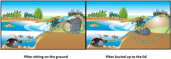 **Special note, if using a waterfall or a long hose between pump and filter the pump will need to be larger to allow for the reduced flow caused by the head (pumping height, and/or hose length) If in doubt fill in one of our e-mail help forms and let us do all the calculations for you.