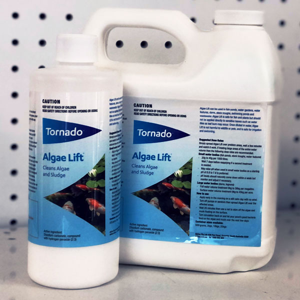 Tornado Algae Lift - Clears Algae and Sludge. It can be used in Fish Ponds, Water gardens, Water Features, Dams, Stock troughs, Swimming Ponds & waste water. Algae lift is safe for Fish and plants but should not be applied directly to sensitive leaves such as water lilies as leaf burn may occur. Once diluted in water, Algae lft is not harmful to wildlife or pets, and is safe for irrigation and swimming. a 500 gram pack can treat up to 12,500 litres, or 6,250 for 2 doses.