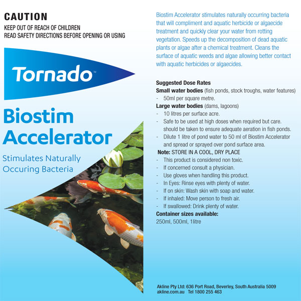 Tornado Biostim Accelerator - Does exactly that. Stimulates naturally occurring Bacteria. It stimulates naturally occuring bacteria that will compliment any aquatic herbicide or algaecide treatment and quickly clear your water from rotting vegetation. Speeds up the decomposition of dead aquatic plants or algae after a chemical teatment. Cleans the surface of aquatic weeds and algae allowing better contact with aqautic herbicides or algaecides.