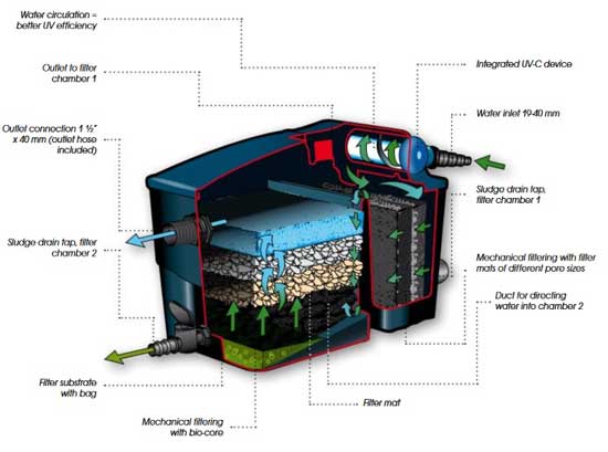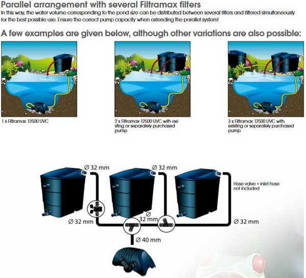 - A modular system. Link multiple Ubbink Filtramax 12500 filters together with a single pump for larger ponds. Easy to extend your filtration system if your fish grow larger/breed or increase the size of the pond. (See diagram towards the bottom)